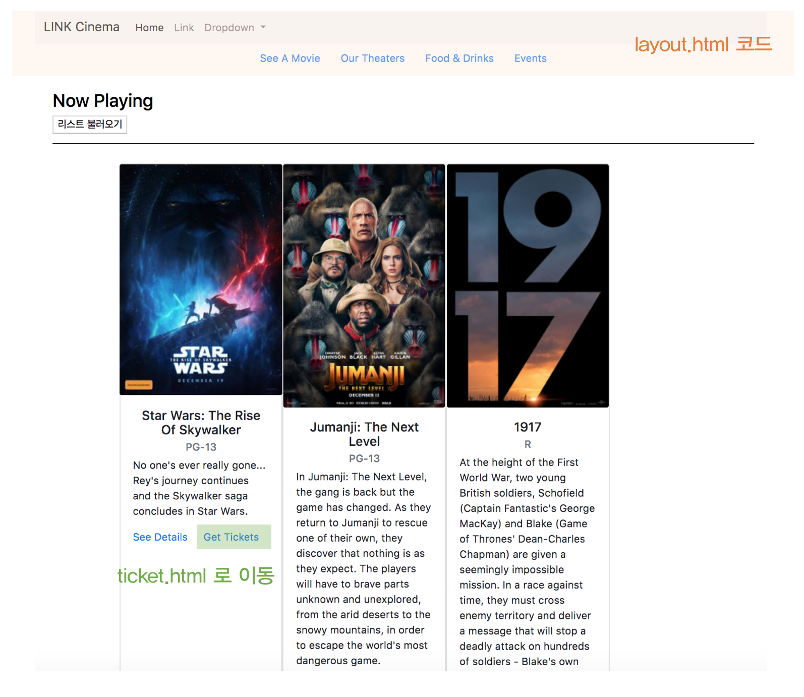 나머지 파일들은 'layout.html' 을 상속받아 각 화면별 필요한 기능들을 구현하였다. 'index.html' 은 처음 진입했을 때 나오는 화면을, 'ticket.html' 은 영화 티켓을 구매하는 화면을 작업할 예정이다.